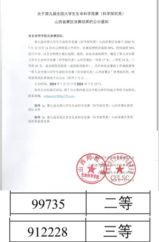 近日,第九届全国大学生生命科学竞赛(科学探究类)山西省赛区决赛在山西师范大学生命科学学院成功举行,我系师生在竞赛中表现优异,由曹俊宇博士和郭俊娥博士指导项目分别取得省级二等奖一项、省级三等奖一项。