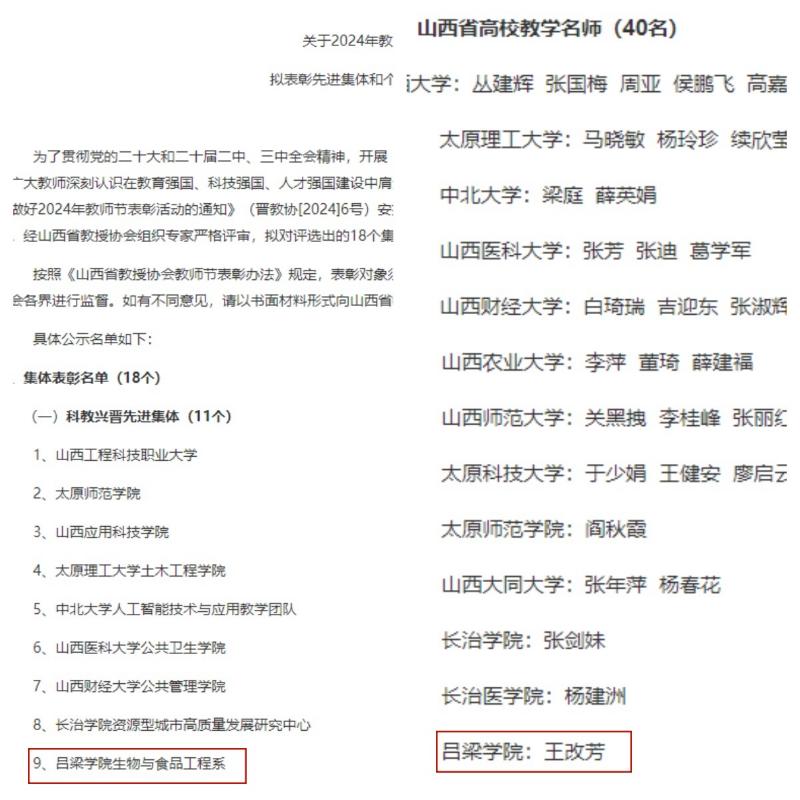 近日,山西省教授协会发布了《关于2024年教师节拟表彰先进集体和个人的公示》公告,对我省18个集体和94名个人进行表彰对象予以公示,其中,我系被授予“科教兴晋先进集体”荣誉称号,王改芳教师被授予“山西省高校教学名师”。