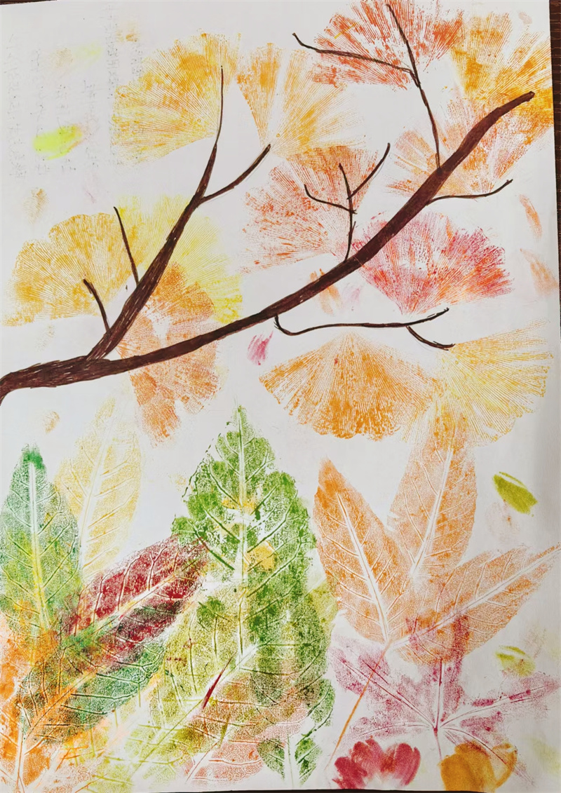 创作过程中,同学们相互交流、相互启发。他们分享着自己对秋天的感悟,探讨着如何用色彩和线条更好地表达秋之韵味。思维的火花在这里碰撞,创意的源泉在这里涌动。有的同学将不同颜色的树叶组合在一起,创造出绚丽多彩的画面;有的则在拓印的基础上进行二次创作,添加一些细腻的线条和图案,使作品更加生动有趣。