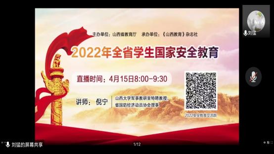 会议开始,由主持人刘猛组织大家一同观看国家安全教育日的直播课。直播中,首先就什么是安全教育进行了了解。倪宁教授为我们讲解我国的周边环境严峻,从静态视角,为我们讲解了在我国国土辽阔的同时,也面临许多的问题,太平洋问题形势严峻。