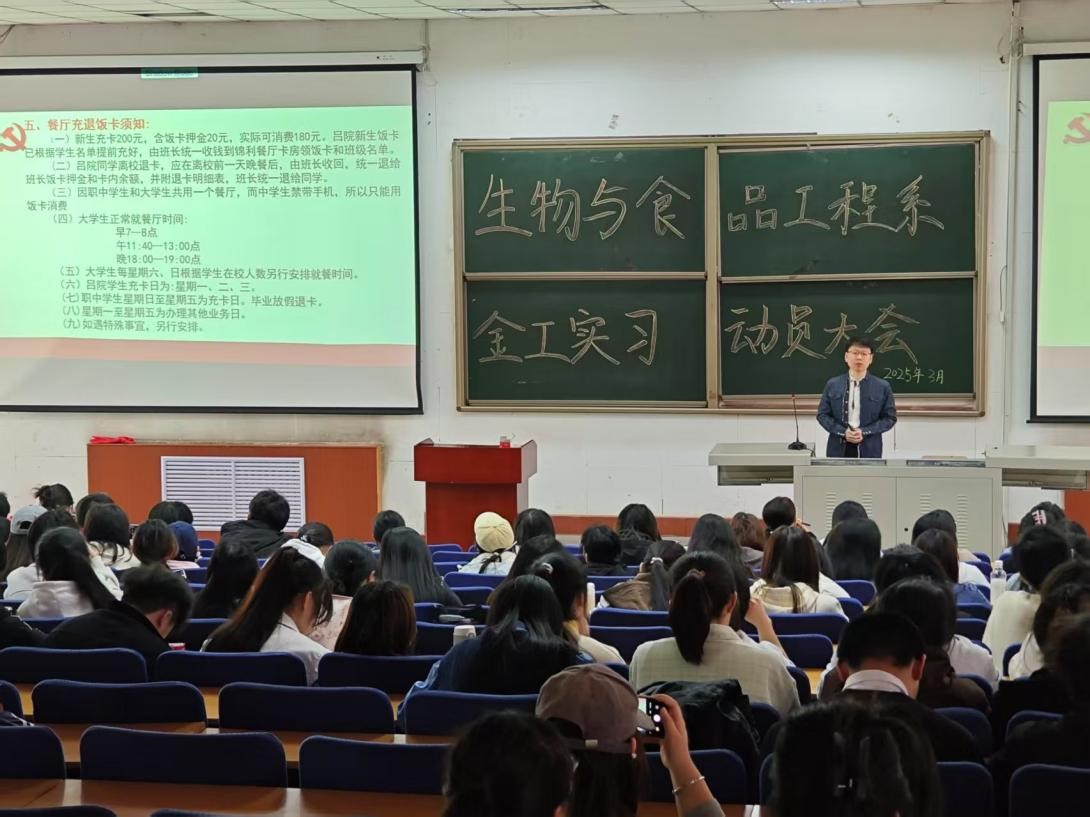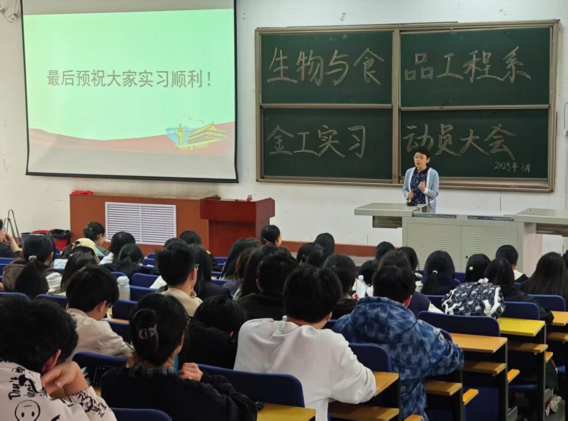 为扎实推进实践教学环节,提升学生工程素养与综合能力,2025 年3月25日,太阳集团tyc151cc在2C-201教室召开 2023 级金工实习动员大会。参加本次会议的有系领导,食品科学与工程、食品质量与安全专业负责人及参与实习的全体学生。