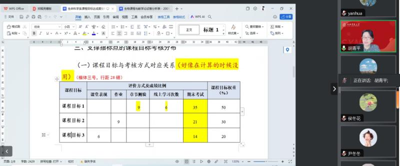 胡教授详细解释学校的《课程目标达成度分析及持续改进报告》和《试卷分析表》每一内容设计目的和教师完成时注意的核心点。指出课程目标达成度分析时要关注最低目标达成度,具体分析达成度低的原因,提出与原因相对应的改进意见。就《试卷分析表》中“试题对课程目标的支撑度分析”内容,胡教授指出以试题出发落脚到课程目标为好,学生达成度情况做散点图具体分析找出问题。随后胡教授分享自己所带《微生物学》课程达成度报告,指出完成达成度报告的关键点。
