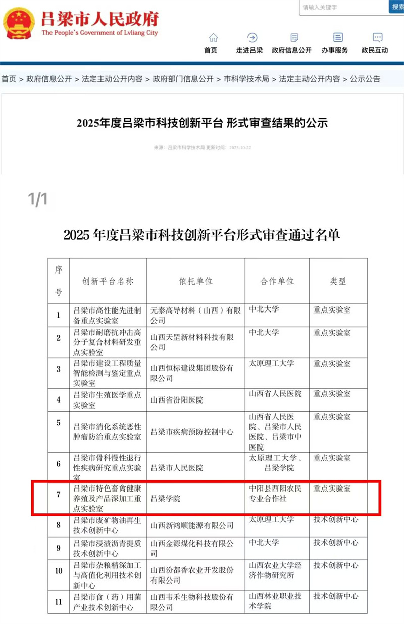 近日,吕梁市科学技术局公布《关于2025年度吕梁市科技创新平台建设拟立项名单的公示》项目名单,由我系申报的创新平台项目吕梁市特色畜禽健康养殖及产品深加工重点实验室”成功获批。