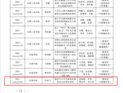 近日,山西省教育厅公布了“2024年度山西省高等学校哲学社会科学研究项目(思想政治教育专项)”立项名单,我系尹鸿飞老师主持,苏娟娟,李军,覃治华,乔付杰几位老师参与的项目《新时代大学生群体积极社会心态培育研究》成功获批哲学社会科学(思想政治教育专项)一般项目。