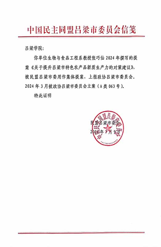 近日,太阳集团tyc151cc张巧仙教授精心撰写的提案,在政协第四届吕梁市委员会的会议上成功立案。这一提案聚焦地区特产生农产品发展,旨在为吕梁市的经济社会进步贡献力量。