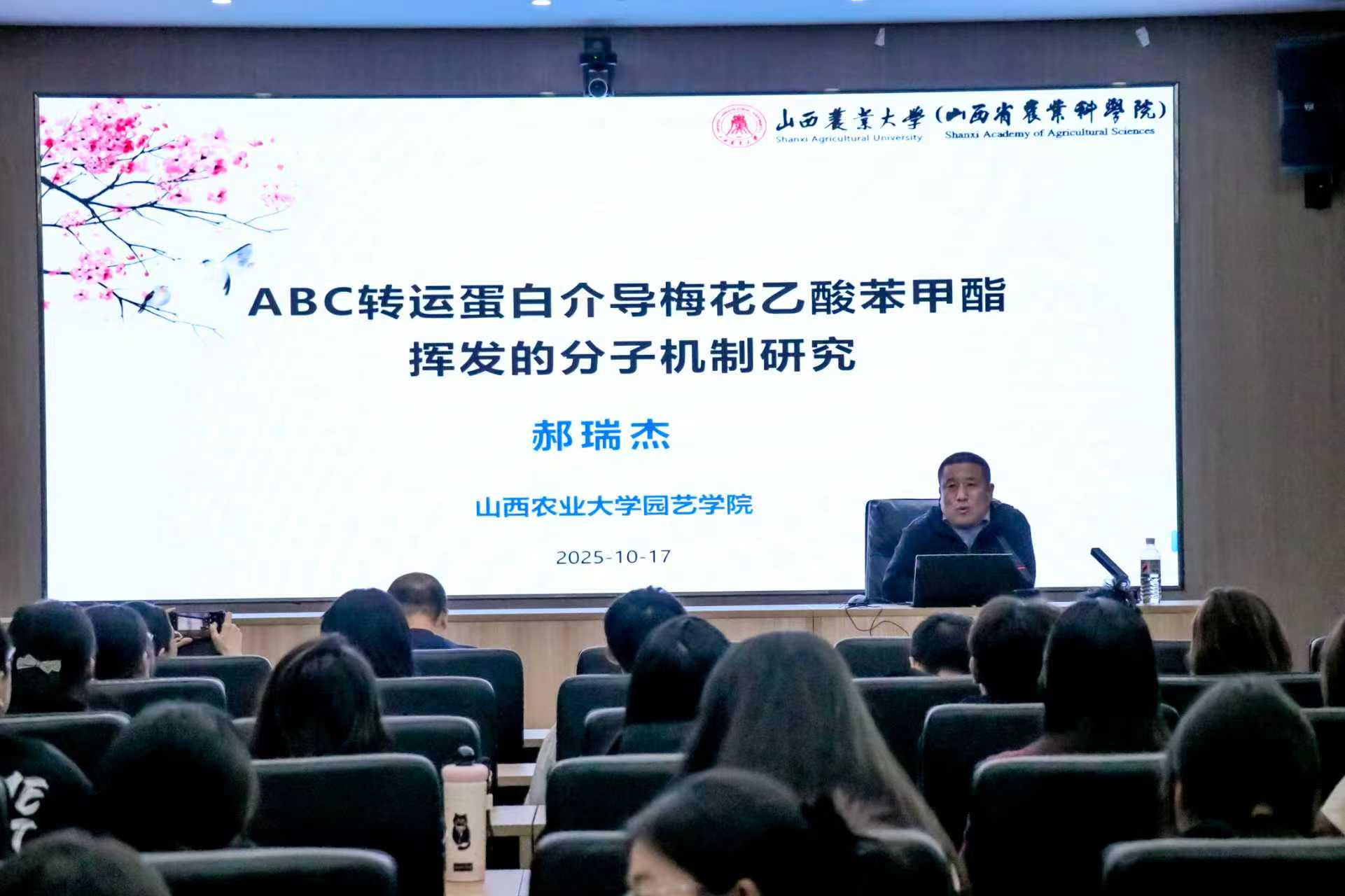 郝瑞杰教授,主要研究领域为园林园艺植物芳香机理,芳香成分开发与利用,在芳香成分挥发机理、芳香成分提纯鉴定、玫瑰纯露产品开发与利用、玫瑰干花产品开发与利用、玫瑰标准化栽培等方面进行了大量理论与实际研究。此次讲座主题为“ABC转运蛋白介导梅花乙酸苯甲酯挥发的分子机制研究”。郝瑞杰教授针对梅花特征花香的研究成果,首先介绍了植物花香成分的功能;随后围绕乙酸苯甲酯的跨膜转运过程,阐述PmABCG9的功能;并进一步介绍PmABCG9与PmERF113的互作机制,揭示植物花香成分挥发的调控机理。郝老师这场学术报告,不仅是一次前沿成果的分享,更是一堂兼具深度与温度的学术示范课,让我们深刻感受到严谨科研与探索热情的完美融合。