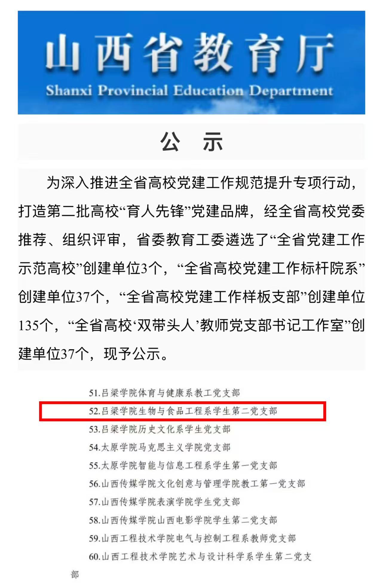 近日,山西省委教育工委发布《关于公布第二批高校“育人先锋”党建品牌项目拟入选公示名单,我系学生第二党支部成功入选第二批“全省高校党建工作样板支部”创建单位。