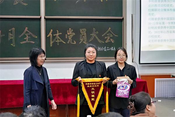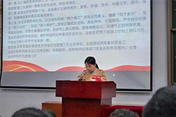 随后,教工党支部书记郭芳领学《中国共产党党员网络行为规定》并组织全体师生党员集中观看学习了全面从严治党微视频《制胜之道》,教育引导全体师生党员严格执行和维护党的纪律,强化自我约束,筑牢廉洁防线,涵养清风正气,切实将铁的纪律真正转化为日常习惯和自觉遵循。大会还对第一届社区党旗飘飘党员示范型文明寝室和《学习强国》学霸进行了表彰。