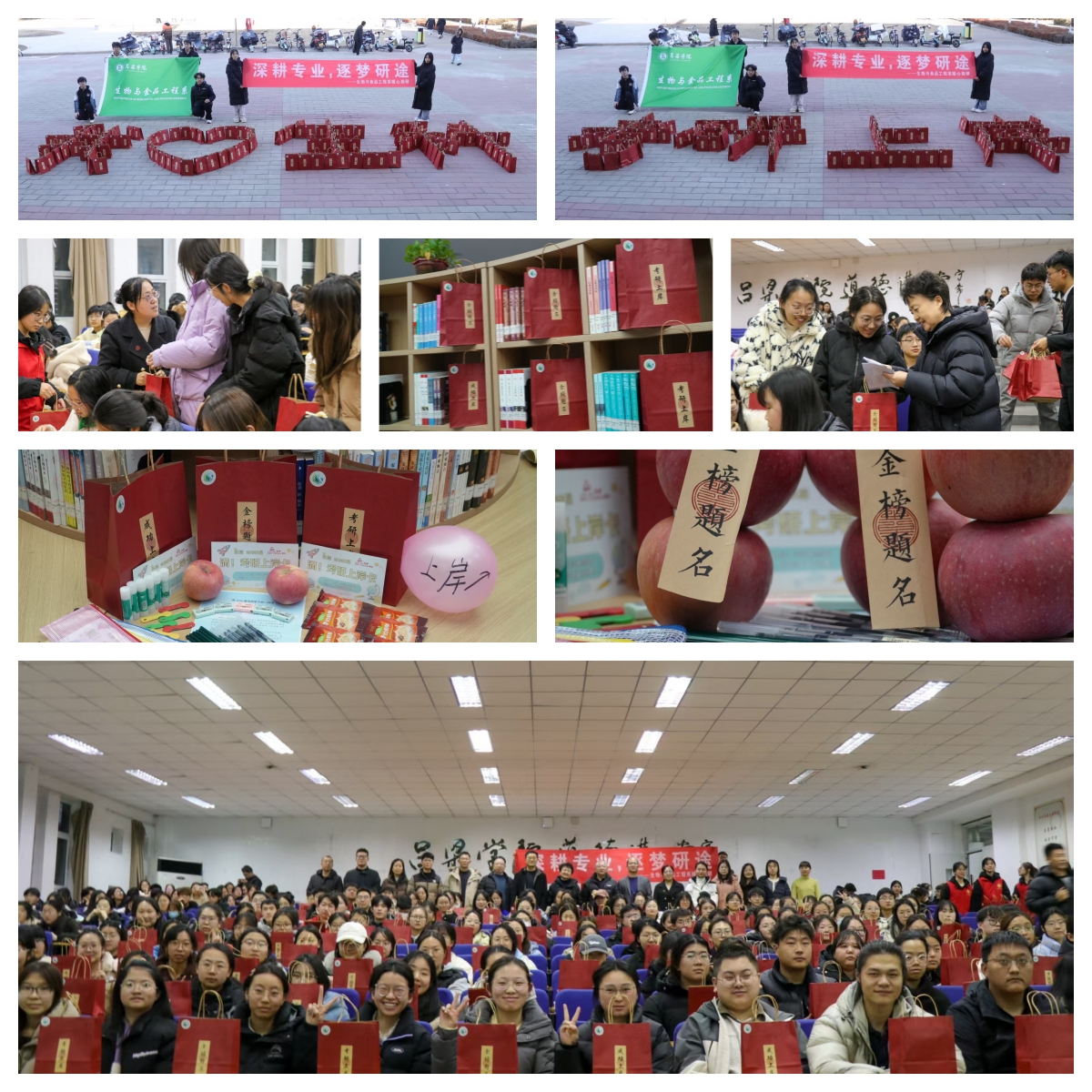 随后,与会领导和老师为同学们送上考研“暖心大礼包”,此次送出的“大礼包”内含丰富且寓意深远的礼物:印着系徽与未来可期字样的定制红色纸袋包象征着“包你上岸”,福袋中装有精心挑选富含美好寓意的小礼品,以及来自23级学弟学妹的一封祝福信。其苹果寓意果然有你,平安顺遂奶茶寓意“氛围轻松,缓解压力”文具包寓意挥洒自如,书写精彩考研试卷寓意“心想事成,一战成硕”每一份礼物都凝聚着系部对考研学子的深情厚谊,更传递着一种温暖与力量。