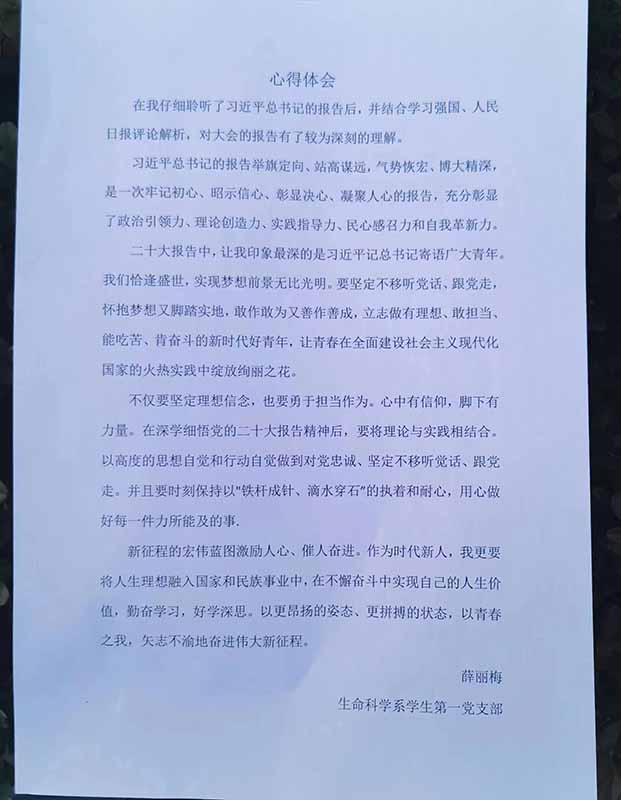 活动结束后,大家纷纷书写了自己的心得体会,深刻领会党的二十大精神。我们要怀抱梦想又脚踏实地,敢想敢做,又善做善成,立志做有理想、敢担当、能吃苦、肯奋斗的新时代好青年,让青春在全面建设社会主义现代化国家的实践中绽放绚丽之花!