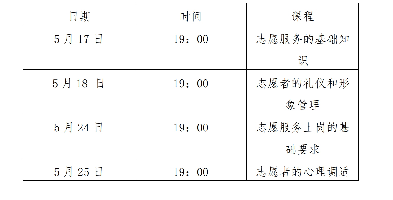 为积极推动青年公益人才培育,倡导志愿服务精神,落实青年志愿者岗前培训要求,山西省青年志愿者协会联合“志愿汇” 平台共同推出“山西省大学生志愿服务公开课”系列培训活动,为广大青年志愿者提供志愿服务的基础理念教育和服务能力指导。课程安排: