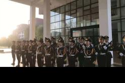 伴随着微风,国旗护卫队成员在电教楼前整装待发,每位成员昂首挺胸,充满自信,他们的肩章在阳光下熠熠生辉。