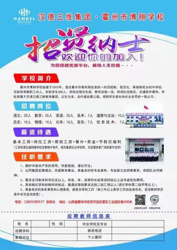 招聘广告:汉德三维集团*霍州市博翔学校是一所全日制民办初中学校,现招聘语文20人、数学20人、英语20人、美术7人、道德与法治10人、历史10人、物理10人、化学10人、音乐7人、信息技术7人,联系电话13835399577(张校长),岗位要求及待遇详见宣传页内容。请未就业毕业生抓住机会求职。